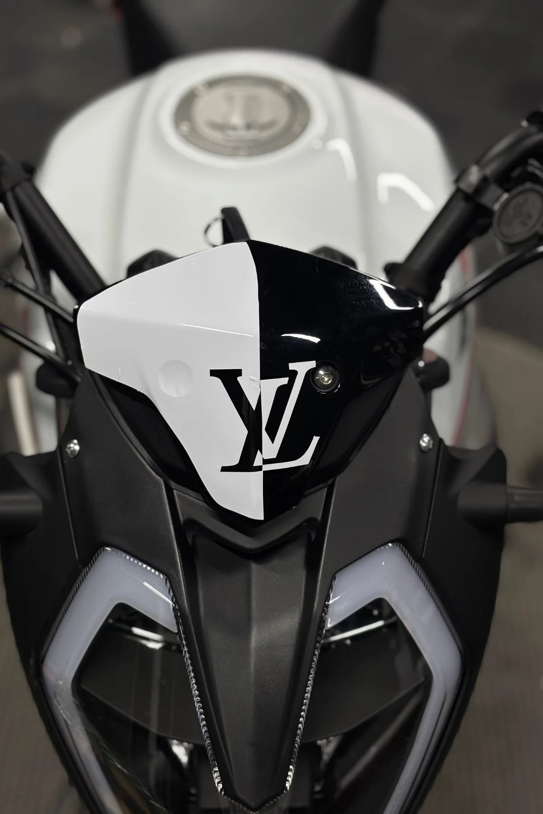 Benelli 125S ve RKS RK125 modelleri için özel olarak tasarlanmış beyaz renkli LV desenli kafa...